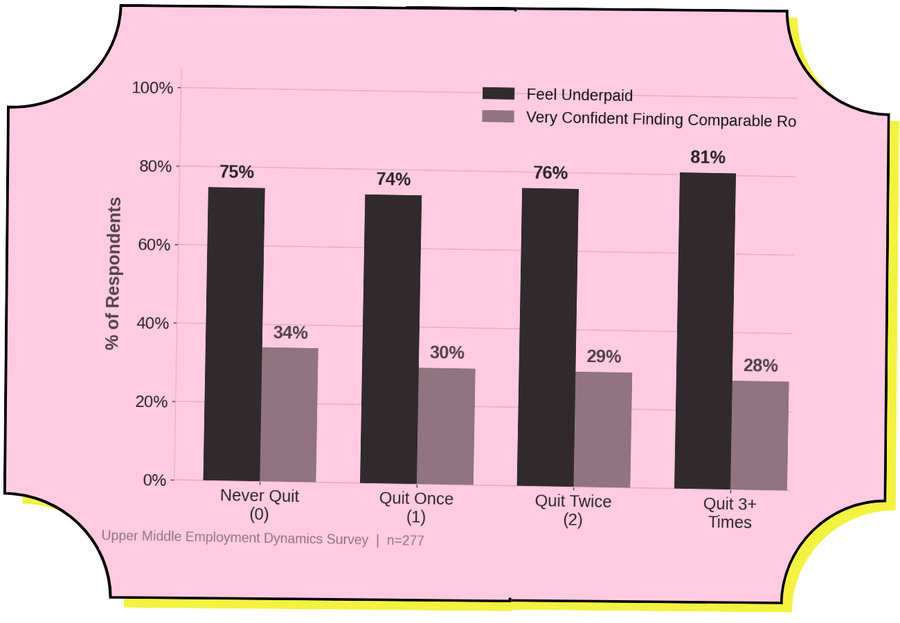 The serial quitter data produces a related irony. Respondents who have voluntarily left three or more roles are the most confident in finding a new job (only 19.4% not confident, compared to 30.8% among those who've never quit), and the most exit-ready in their current position (58.3% would leave if financially independent). They know they can do it. And yet… 80.6% feel underpaid in their current role – the highest underpaid rate of any quit-history group – and their silent loyalty rate (22.2%) is statistically indistinguishable from people who have never voluntarily left anything (30.8%). In other words, serial quitting increases workers’ confidence in the long-term value of their skills, but does not appear to produce greater contentment. The always wind up in more or less the same standoff and seemingly quit when they get bored of the specifics. Work is a story about the battle of talent against stasis.